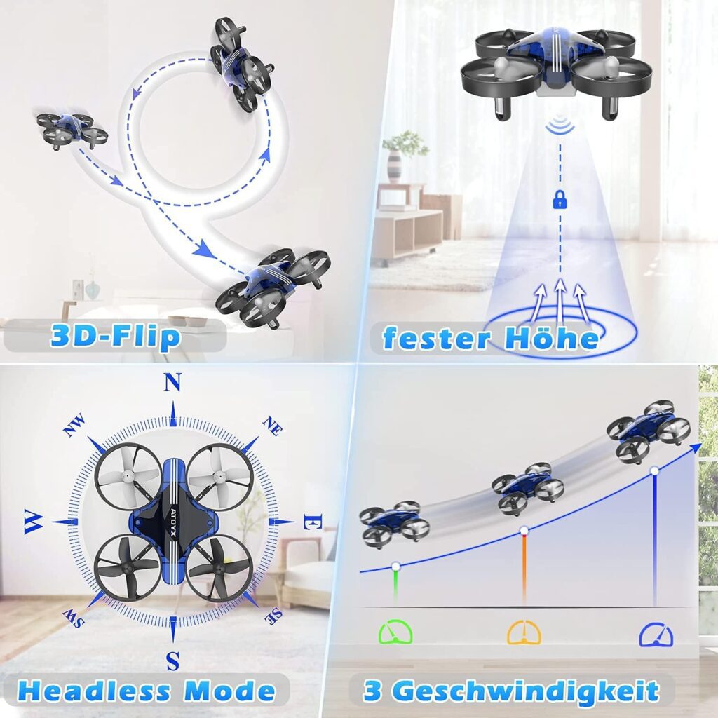 The ATOYX RC Mini Drone has an amazing flight performance. The altitude hold feature allows the drone to keep a constant height, allowing novices to focus on managing its movement rather than worrying about manually maintaining the right altitude. The ability to do 3D flips and 360° rotations adds a fun aspect to the flight experience. Furthermore, the drone has three speed settings, allowing users to change the flying speed based on their skill level and choice.