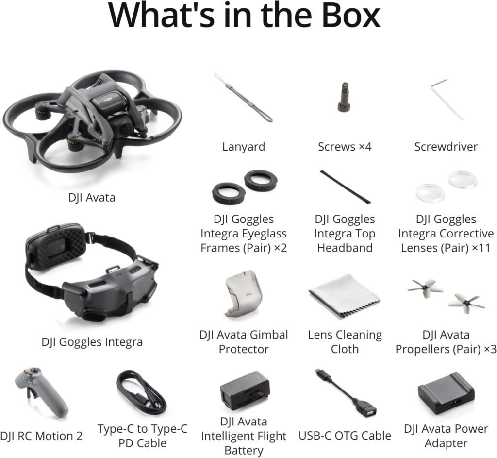 | Included Components | DJI Avata Propellers (Pair) x3, Screwdriver x1, DJI Avata Power Adapter x1, DJI Avata Gimbal Protector x1, USB-C OTG Cable x1, DJI Avata Intelligent Flight Battery x1, Lens Cleaning Cloth x1, Lanyard x1, DJI Goggles Integra Eyeglass Frames (Pair) x2, Type-C to Type-C PD Cable x1, DJI Goggles Integra x1, DJI RC Motion 2 x1, DJI Avata x1, Screws x4, DJI Goggles Integra Top Headband x1, DJI Goggles Integra Corrective Lenses (Pair) x11 |