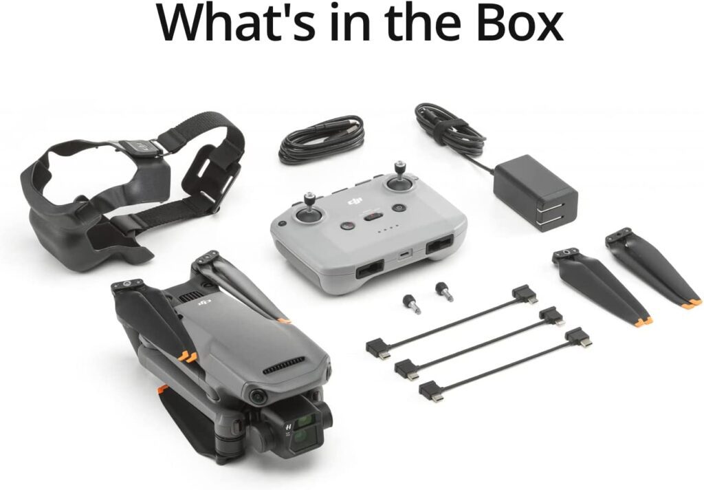 Cover IncludedDJI Mavic 3 drone, DJI RC-N1 remote controller, DJI RC-N1 remote controller control sticks (pair), DJI RC-N1 RC cable (USB Type-C Connector), DJI RC-N1 RC cable (Standard Micro-USB Connector), DJI RC-N1 RC cable (Lightning Connector), DJI Mavic 3 intelligent flight battery, DJI Mavic 3 low-noise propellers (pair), DJI 65W portable charger, DJI Mavic 3 storage cover, Type-C cable