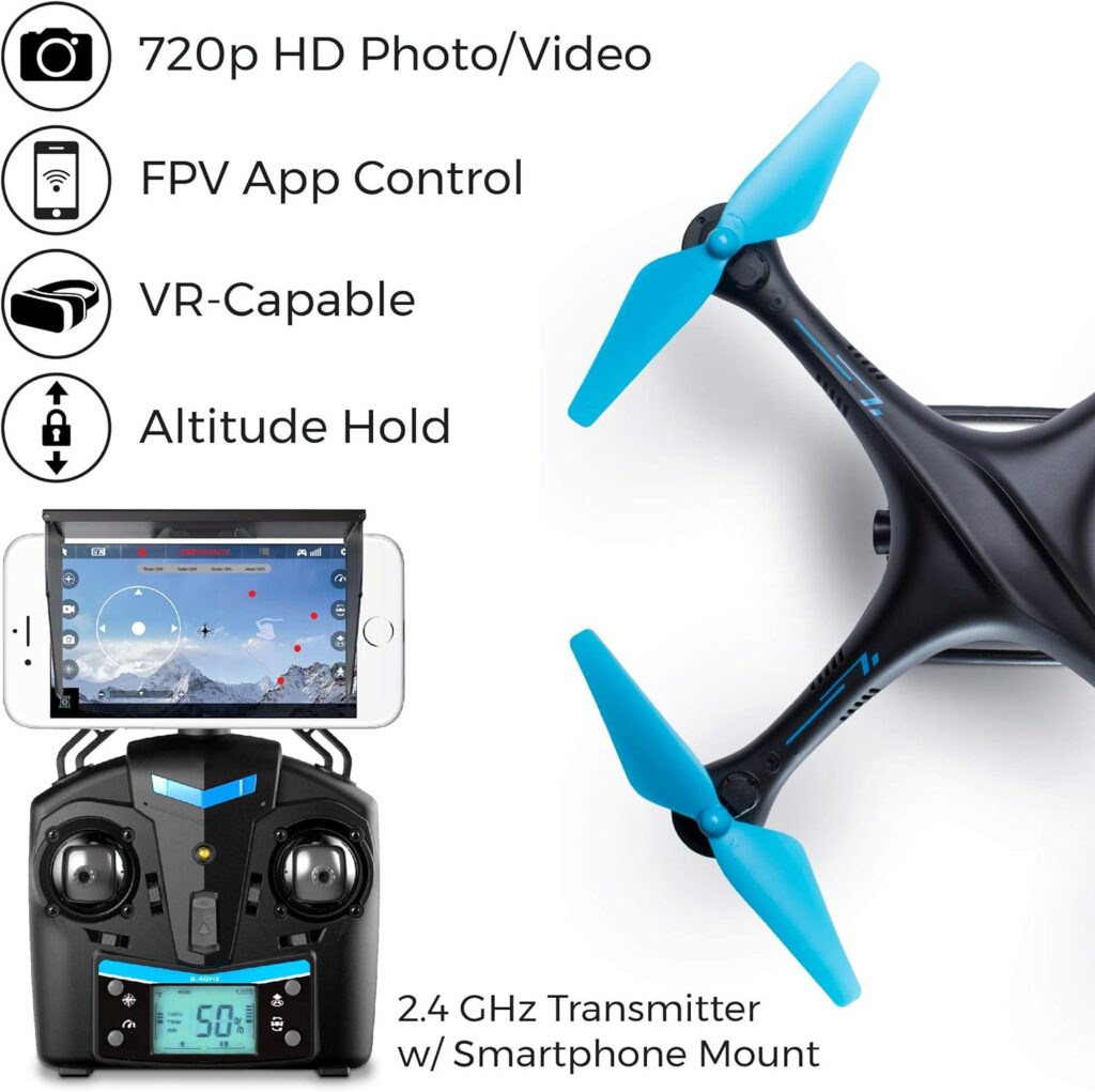 The Force1 U45WF Drone is an easy-to-use, WiFi-enabled drone with features that are suitable for novices. It has a 720p HD camera for aerial photography and can broadcast live video to your smartphone. This Force1 U45WF Drone is designed to provide a pleasant flying experience for both adults and children by including a variety of features and simple controls.