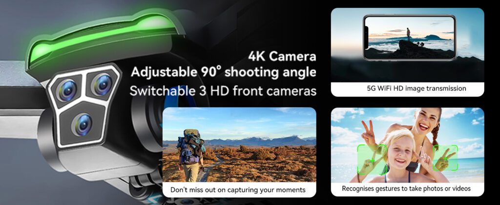 The HYTOBP S166 Drone, which features a triple 4K camera system and a motorized, adjustable 90° lens, takes stunning aerial images and shoots 1080P films. The 5GHz communication enables high-quality picture transfer, while the option to swap between three separate HD front cameras adds adaptability. The drone even understands motions for taking images and movies, adding a fun element to your flight experience.