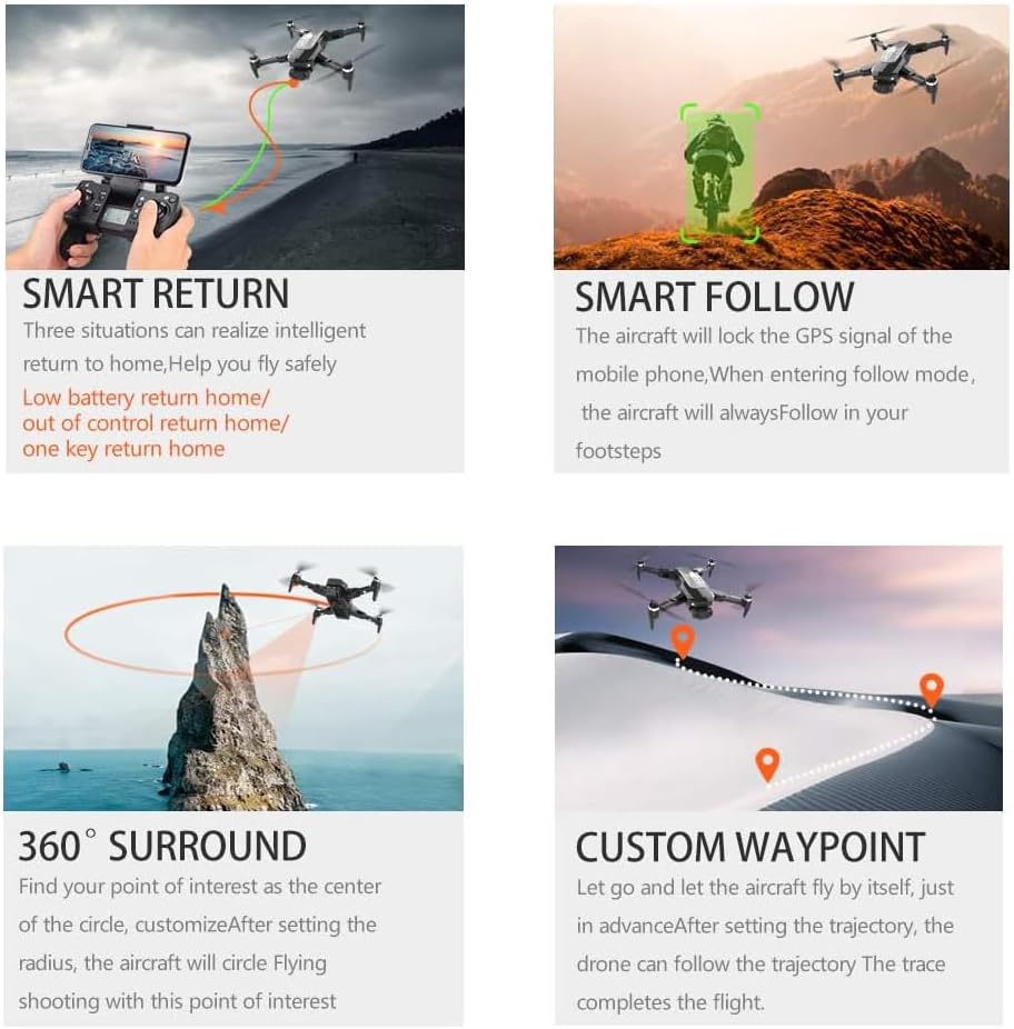 | GPS Follow Me and Smart Follow | Drone follows your movements via GPS for dynamic footage. |