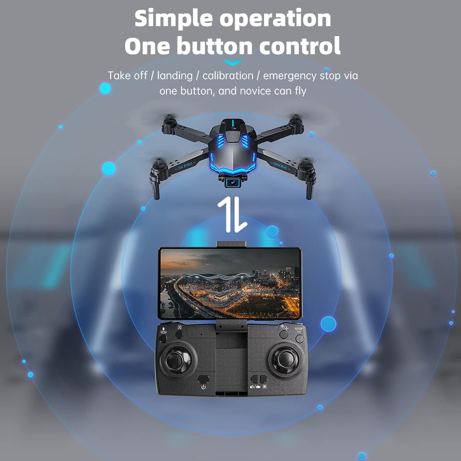 | Safe Design & Long Flight Time | Protective propeller guards, high-quality ABS material, and an emergency stop function ensure safety. Two batteries provide up to 16 minutes of flight time. Low battery warnings help prevent loss. |