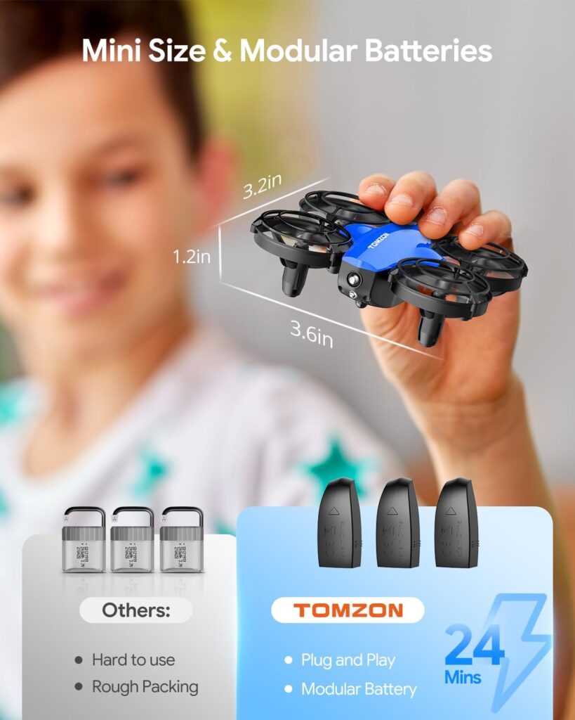 Given its low price, the Tomzon A24 Drone represents exceptional value for money. It has a variety of features and functionality to ensure that youngsters have a great flying experience. Its long-lasting design and safety features make it a dependable alternative for parents worried about their children’s safety during flights. The presence of three modular batteries extends the drone’s playtime, providing more enjoyment in the air.