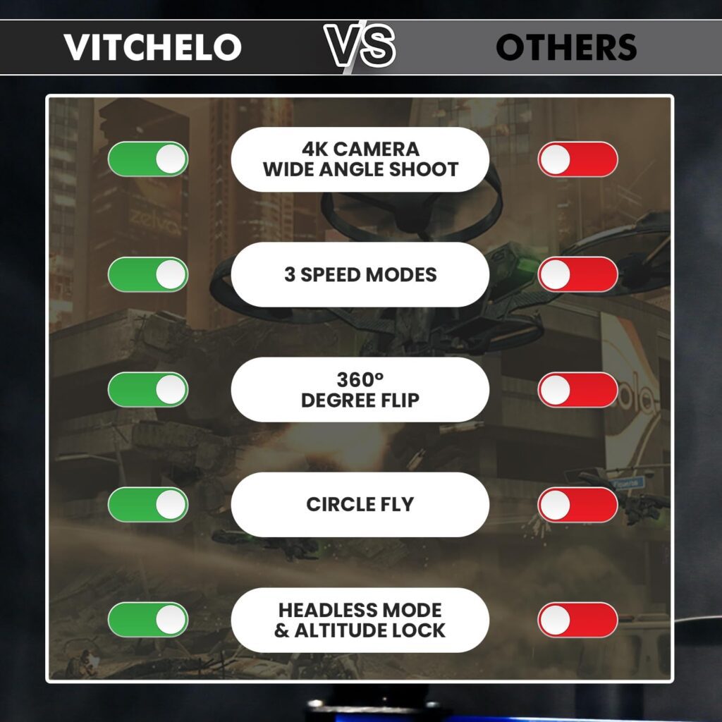 The Vitchelo Quadcopter Drone does not include a built-in camera. This design decision stresses durability and adaptability above collecting aerial footage. However, the drone’s superb flight performance and stability make it an ideal platform for mounting a tiny action camera, if desired. The real-time flight monitoring screen on the remote control makes up for the lack of an inbuilt camera by giving users an excellent picture of the drone’s position and surroundings.